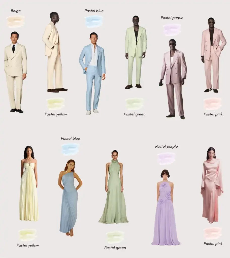Soft tones like powder blue, sage, beige, or light grey. A pastel shirt, linen suit, or just a subtle touch works beautifully.